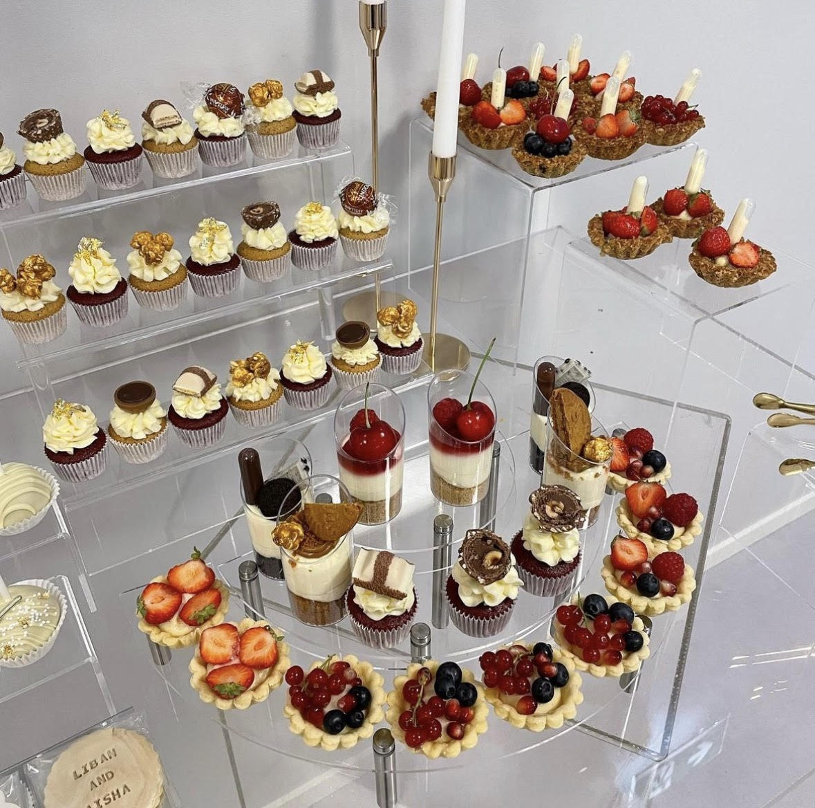 Elegant dessertcatering presenterad på exklusiva akrylställ perfekt för bröllop, förlovningar, babyshowers och lyxiga privata events.